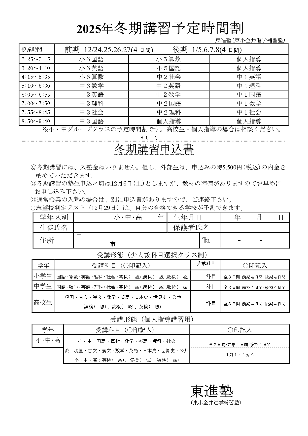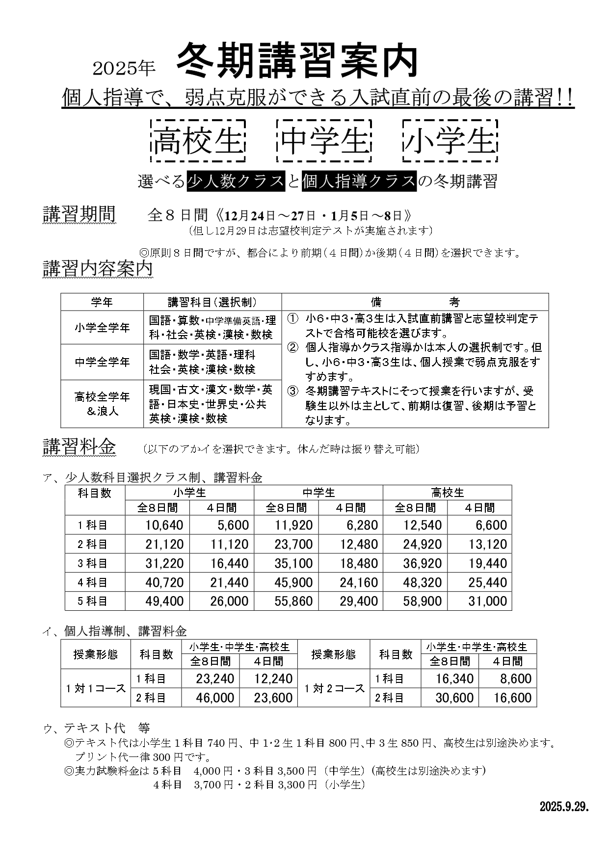 2025年『冬期講習』のご案内《12月24日(水)~27日(土)・1月5日(月)~8日(木)》