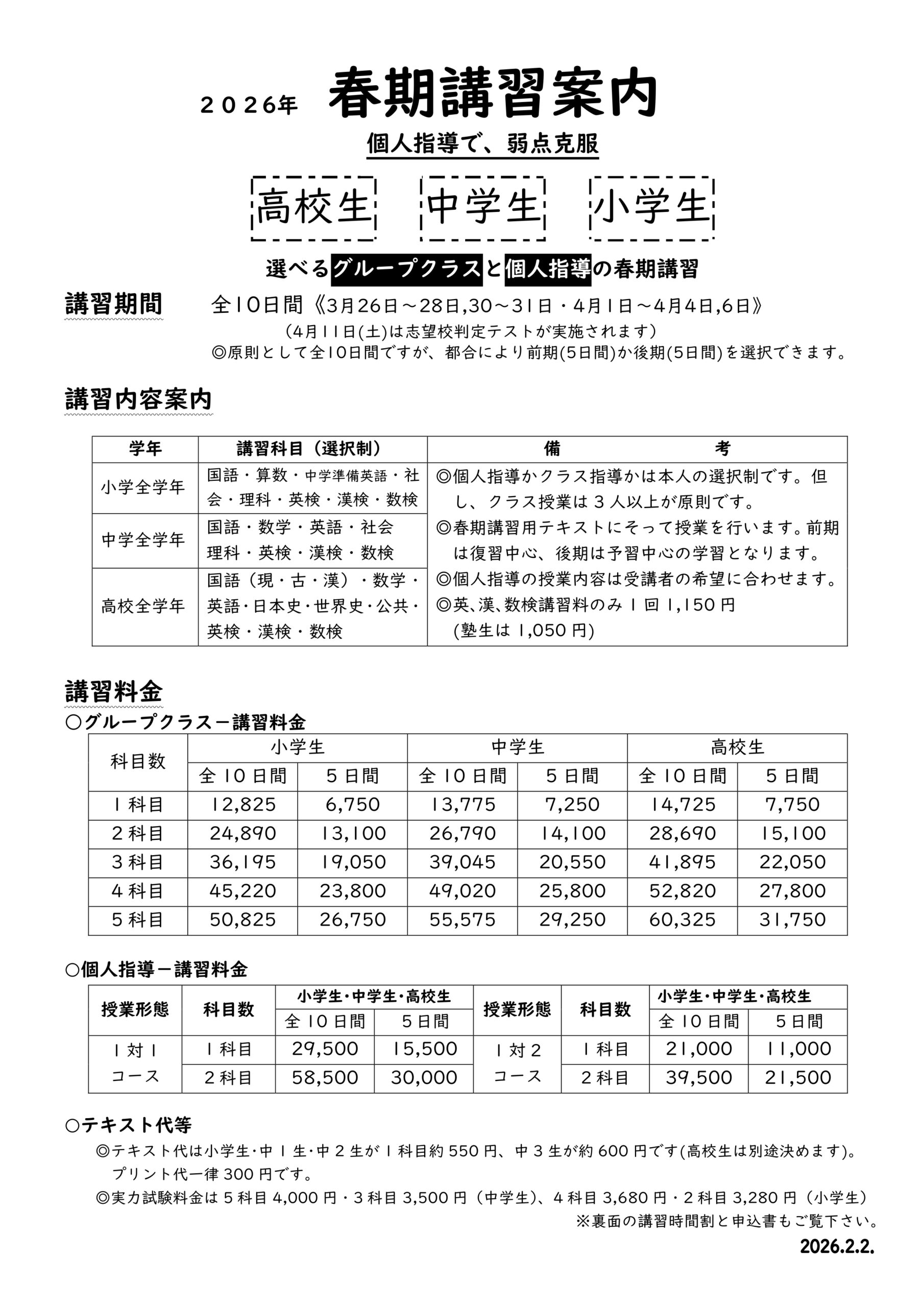 2026年『春期講習』のご案内《3月26日~28日、30~31日・4月1日~4日、6日》