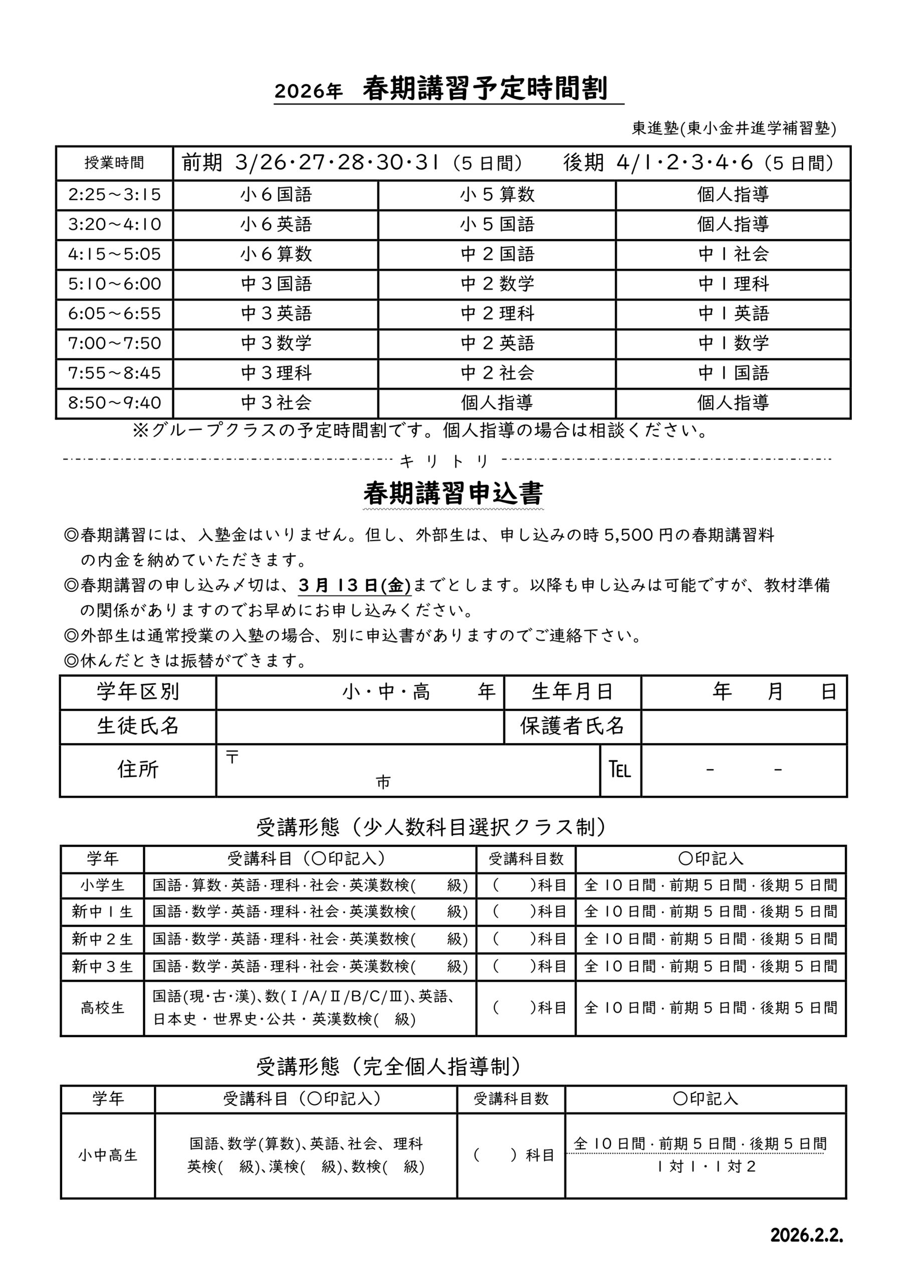2026年春期講習時間割(塾生用)