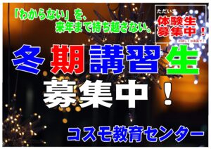 DM用チラシ 冬期講習 表2025 2025.10.21 Tweet Share +1 Hatena Pocket RSS feedly Pin it 関連記事一覧 コスモ教育センターTOPICS始めます。 2023年『冬期講習』のご案内《12月25日~28日・1... 2025年『春期講習』のご案内《3月26日~29日・30... 【営業再開のお知らせ】6月1日~ 2025年『冬期講習』のご案内《12月24日(水)~27... 充実の成績UPシステムで多彩な合格実績を確保いたしており... 苦手科目の勉強に行き詰まりを感じていませんか? 2021年『春期講習』のご案内 Native(外国人)講師の指導で自然な英会話を学びませ...
